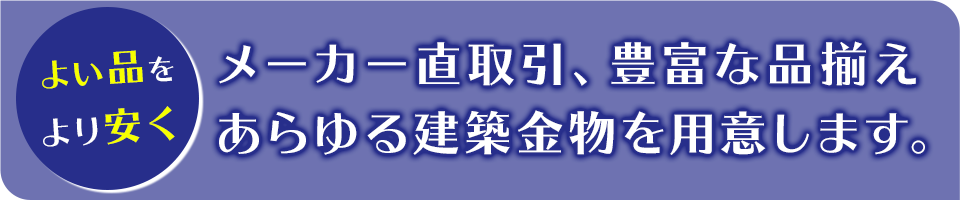 嘉田清金物店は貝塚エリアで建築金物・電動工具を長年にわたり扱ってまいりました。大阪府貝塚市・岸和田市・泉佐野市全域に即日・現場配達等、柔軟に対応しております。ご要望に合わせた建物金物・工具をメーカー直取引で交渉いたしますので、現場の資材の不足等の際は、ぜひ豊富な品揃えの嘉田清金物店にお任せください。
